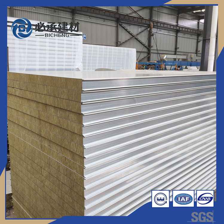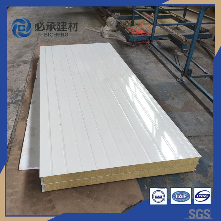巖棉塊之間和巖棉與上、下層鋼板之間通過高強度發(fā)泡劑粘接而形成整體,精良的生產(chǎn)工藝保證了高密度的巖棉隔熱體與金屬板內(nèi)壁之間能產(chǎn)生極強的粘著力,從而使巖棉夾芯板具有很好的剛度。